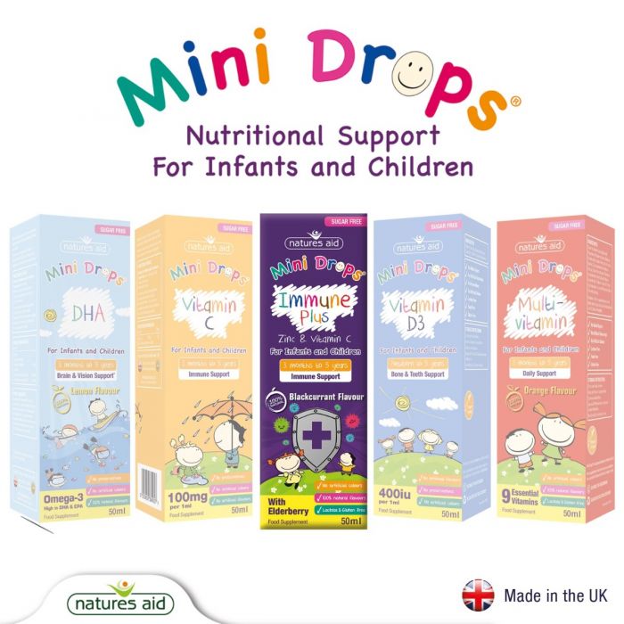 Mini Drops Immune Plus chứa Kẽm, Vitamin C, Vitamin B12 và Axit Folic, tất cả đều hỗ trợ hoạt động khỏe mạnh của hệ thống miễn dịch. Vitamin B12 và Axit Folic cũng giúp giảm mệt mỏi, tăng cường năng lượng, sức khoẻ.